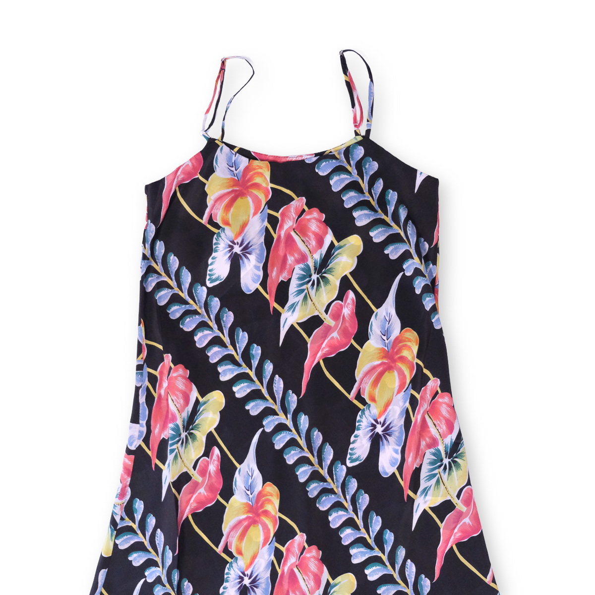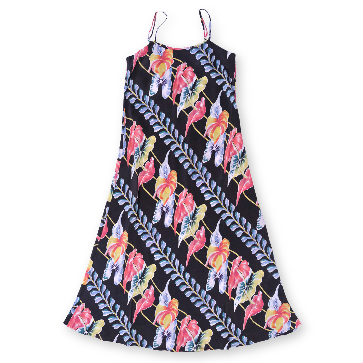 This striking vertical border print is a masterclass in tropical aesthetics. Our “Anthurium Border” print features lush anthuriums, also know as “The Heart of Hawai`i” running down on an onyx black canvas providing high contrast for that beautiful pigment pop.
